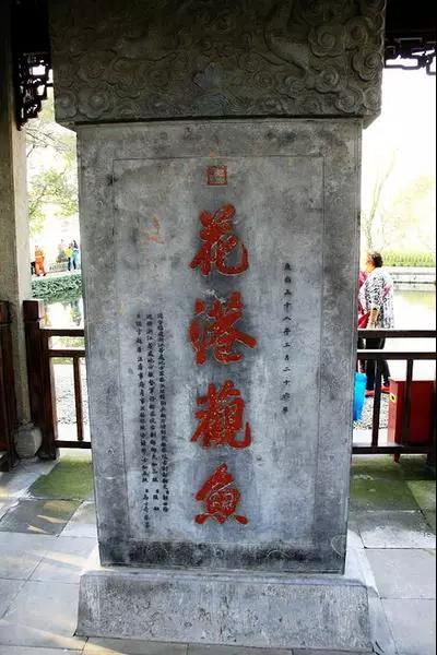 “花港观鱼”碑,也是康熙皇帝的御笔,“鱼”字少一点是“有意写错”。